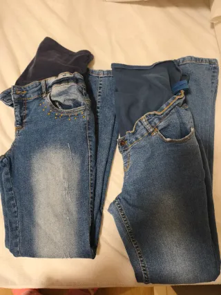 Pantalones vaqueros diseñados para el embarazo. - Cintura elástica para mayor comodidad. - Diseño tipo flare o campana. - Adorno de tachuelas doradas en uno de los bolsillos. Y camisetas/camisas ideales para dar de mamar. Está todo como nuevo.