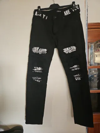 Pantalón vaquero de hombre talla 32. En perfecto estado. - Estilo motero con detalles rasgados. - Cremalleras en los tobillos. - Estampados gráficos en las perneras.