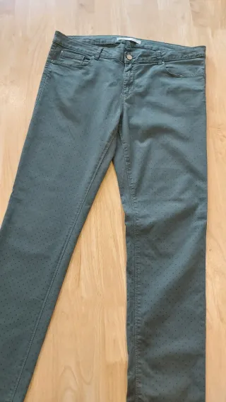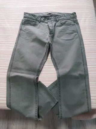 Pantalón vaquero de corte moderno. Usado una vez, se vende por talla grande. - Color verde. - Diseño de cinco bolsillos. - Cierre de cremallera y botón.