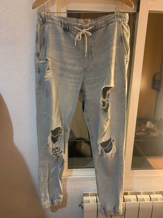 Pantalón vaquero para hombre con un estilo moderno y desgastado. - Cintura elástica con cordón. - Bolsillos laterales. - Efecto desgastado y rotos. - Puños elásticos en los tobillos.