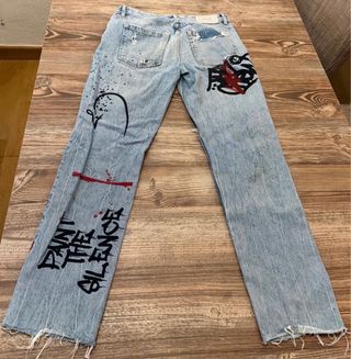 Pantalón vaquero de Bershka con un diseño único y desgastado. - Estilo desgastado con rotos. - Estampados gráficos y de texto. - Lavado azul claro.