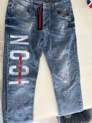 Pantalón vaquero DSQUARED2 con un diseño moderno y llamativo. - Estampado 'ICON' en blanco y rojo. - Detalles de salpicaduras de pintura en rojo y azul. - Cremallera frontal con detalle en rojo. - Número '2' en la parte delantera.