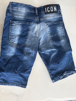 Pantalón corto vaquero con un diseño moderno y detalles llamativos. - Estilo desgastado con rotos. - Pintura salpicada en blanco y rojo. - Cremallera decorativa frontal con etiqueta. - Número 2 estampado en la pernera derecha.