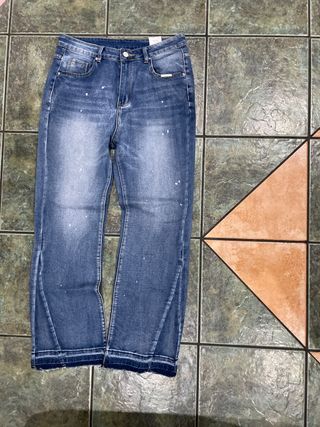 Pantalón vaquero largo con un diseño moderno y detalles únicos. - Estilo flored. - Acabado desgastado con salpicaduras blancas. - Bajo con corte y deshilachado.