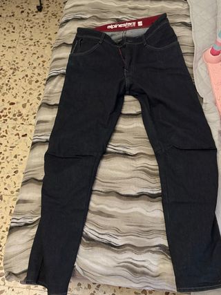 Pantalones vaqueros de la marca Alpinestars en color azul. - Diseño moderno con costuras reforzadas. - Cintura con trabillas para cinturón. - Cierre de cremallera y botón.