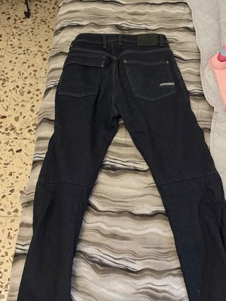 Pantalón vaquero usado de moto en color negro, diseñado para ofrecer protección y comodidad. - Incluye protecciones para rodillas y caderas desmontables. - Diseño tipo cargo con múltiples bolsillos. - Talla 42 - Elastico, ajustado