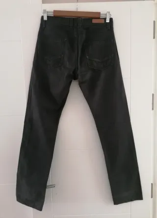 Pantalón vaquero de corte ajustado para hombre. Talla 40 - Cintura con trabillas. - Cierre de cremallera y botón. - Bolsillos delanteros y traseros. - Color gris. -Medidas: *Cintura: 81 cm * Largo pierna: 81 cm En la última foto aparece un pequeño círculo que parece una mancha, pero venía así el tintado del vaquero desde que lo compré.