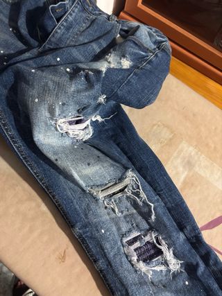 Pantalón vaquero de la marca Amiri con un diseño moderno y desgastado. - Estilo desgastado con rotos. - Parches decorativos en la parte frontal. - Corte moderno.