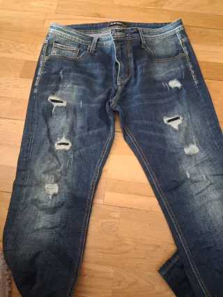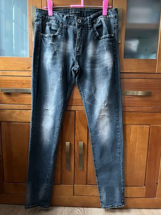 Pantalón vaquero para hombre con un diseño moderno y desgastado. Aporto fotos con medidas - Corte ajustado. - Efecto desgastado y con rotos. - Bolsillos delanteros y traseros.