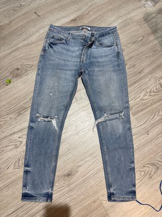 Pantalón vaquero de corte moderno con desgastes. - Diseño con rotos en las rodillas. - Cierre de botones. - Bolsillos delanteros y traseros. - Sin usar.