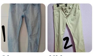 Pantalones a 3 € unidad. 1)Vaqueros de corte clásico de Zara. - Diseño de cinco bolsillos. - Cierre de botón y cremallera. - Trabillas para cinturón. - Vaqueros hombre T-S/34-36 azul elástico (contorno de cintura 90cm. largo 96 cm.) 2)Pantalón de corte recto en color beige. - Cierre de botones. - Bolsillos delanteros y traseros. Pantalón Jeans T-46 beig (contorno cintura 1 metro largo 1,10cm.)