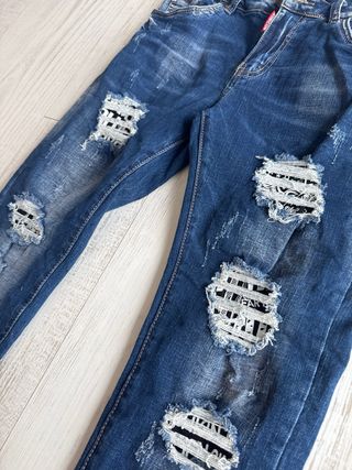 Pantalón vaquero para niño con un diseño moderno y desenfadado. - Estilo desgastado con rotos. - Detalle de manchas blancas. - Corte moderno.