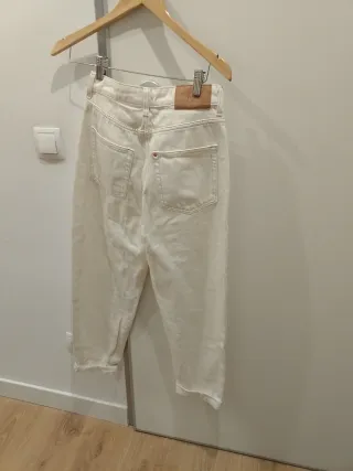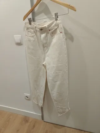 Pantalón vaquero de corte loose mom en color blanco. - Talla 36. - Estilo mom fit. - Bajo deshilachado.