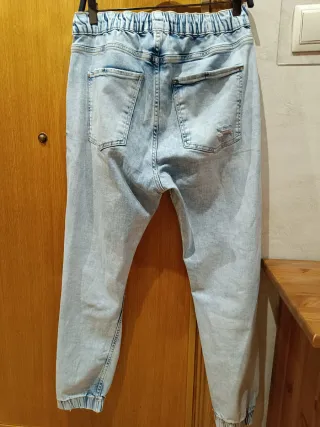Pantalones vaqueros estilo jogger con un diseño moderno y desgastado. - Cintura elástica con cordón. - Bolsillos laterales. - Aberturas desgastadas en las rodillas. - Puños elásticos en los tobillos.