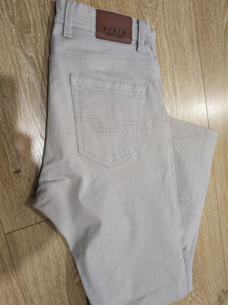 Pantalón vaquero de corte clásico ajustado para hombre. - Color beige. - Cierre de cremallera y botón. - En muy buenas condiciones.
