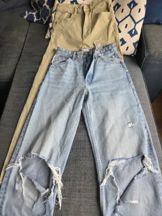 Pantalones vaqueros de corte ancho con rotos en las rodillas. Un estilo moderno y desenfadado. ZARA - Diseño con rotos. - Corte ancho. Pantalon beige. STRADIVARIUS. Estrechos Cada uno 6 euros, si te llevas los 2, 10 euros