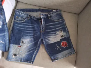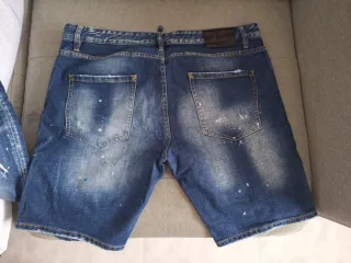 Shorts vaqueros con un diseño moderno y desgastado. - Parches de tela a cuadros. - Efecto salpicaduras de pintura. - Aberturas y rotos. - Estilo desgastado.