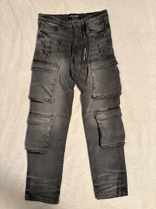 Pantalón vaquero de corte cargo con un acabado desgastado. - Diseño con múltiples bolsillos. - Estilo moderno y urbano. - Estado como nuevo.