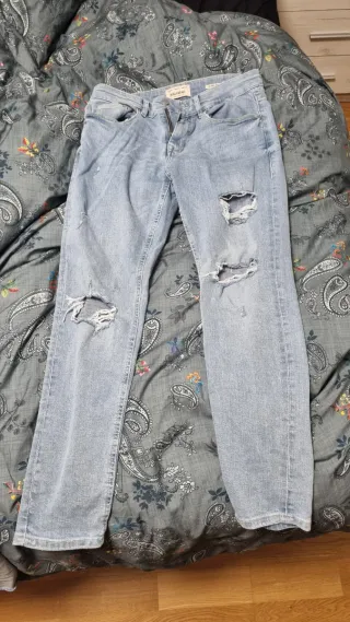 Pantalón vaquero de estilo desgastado con rotos. Se vende por cambio de talla - Diseño moderno y juvenil. - Corte recto. - Cintura con trabillas para cinturón.
