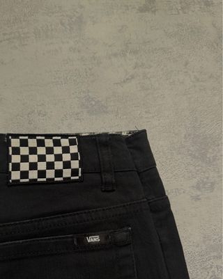 Pantalones vaqueros de la marca Vans en color negro. - Talla S. - Diseño clásico. - Etiqueta con estampado de cuadros en la cintura.