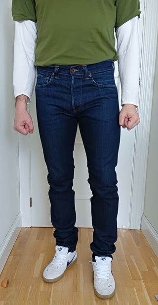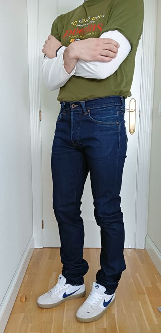 Pantalón vaquero hombre Edwin azul oscuro, en perfecto estado, modelo ED-80 slim tapered, talla 32 (talla correcto), algodón con 3% de elastano, largo 34, 5 bolsillos, sin cortar bajo, poco usados, muy cuidados, denim de muy buena calidad, se adaptan muy bien, cómodos. El color más aproximado es el de las fotos puesto.