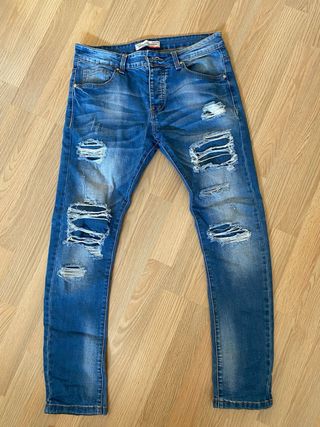 Pantalón vaquero con un diseño moderno y desgastado. - Corte ajustado. - Efecto lavado a la piedra. - Cierre de cremallera y botón.
