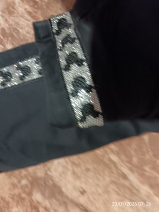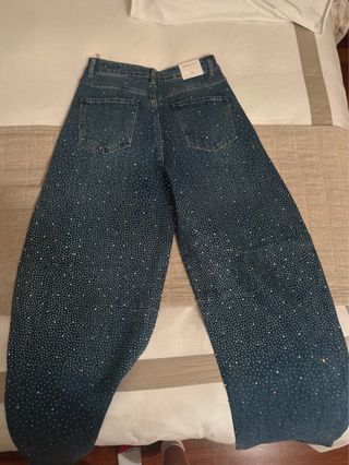 Pantalones vaqueros de corte ancho con un diseño lleno de pedrería brillante. - Diseño con pedrería plateada. - Corte ancho. Está completamente nuevo con la etiqueta, me lo regalaron y me va grande, les costó 70€ (adjunto foto de la web al final)