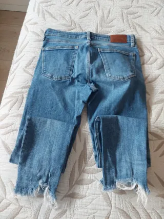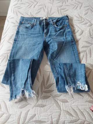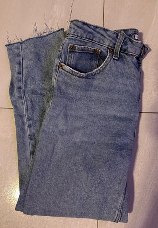 Pantalones vaqueros de mujer de la marca Bershka con un estilo desgastado y moderno.Se ha usado pero esta bien conservado. Talla 34. Se puede ver sin ningún compromiso. Más cosas en mi perfil y más pantalones, Sueters, vestidos, tops, camisetas, chaquetas - Diseño con rotos y detalles desgastados. - Corte recto y favorecedor. - Lavado clásico en tono azul.