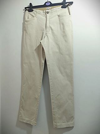 Pantalon vaquero color crema (beige). Tela ligeramente elástica. Tiene los adornos en cintura que son unas hebillas de cuero, se han ido desgastando con el lavado, se pueden quitar Marca : Lloyd's Talla : 38 Cintura : 37//39 cms Cadera : 46//52 cms Tiro : 27 cms Muslo : 28 Largo : 96 cms Ancho bajo pernera : 18 cms