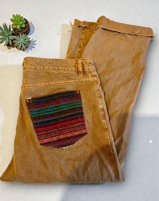 Pantalones vaqueros de estilo vintage con un diseño único. - Tejido de tela vaquera resistente. - Detalle de bolsillo trasero con estampado étnico multicolor. - Acabado desgastado en los bajos.
