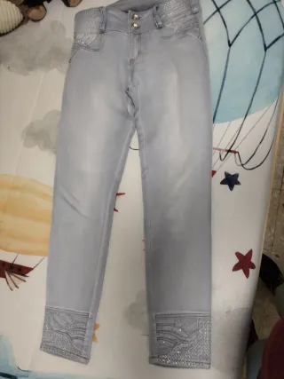 Pantalón colombiano con un diseño moderno y detalles brillantes.talla 38/40. Modelo tobillero,con tacones queda fabuloso. Me costó 52,90€. Talla 12 en colombia.Puesto solo en 1 bautizo - Diseño con pedrería en la cintura y los bajos. - Corte ajustado. - Tejido vaquero.