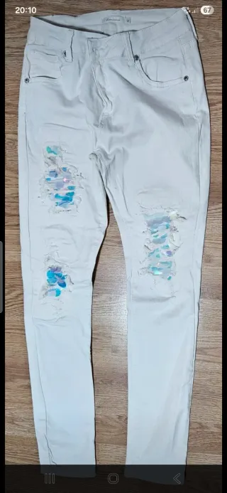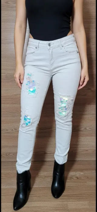 Pantalón vaquero de corte ajustado con detalles de lentejuelas. Nuevo sin etiqueta 🏷 - Diseño rasgado con lentejuelas iridiscentes. - Cintura alta. - Cierre de cremallera y botón.