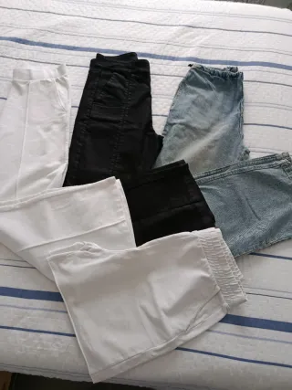 Vendo lote de tres pantalones, talla s/m, están en perfecto estado, uno negro tobillero de vestir M, un vaquero con goma ajustable en cintura una S, y uno blanco de algodón puesto una vez, este último es más una S, muy baratos y regalo pantalón corto blanco de algodón M. Más cosas en mi perfil