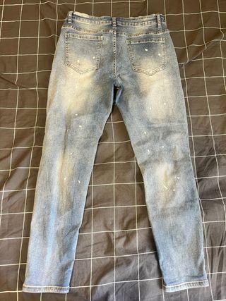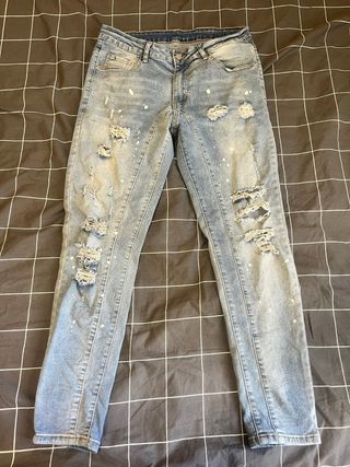 Pantalones vaqueros con un diseño moderno y desgastado. - Estilo desgarrado y con salpicaduras de pintura. - Corte ajustado.