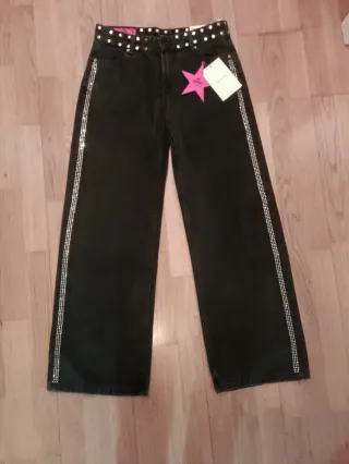 Pantalón vaquero de la marca One Dilemma, talla 34. Diseño con pedrería. - Corte: Loose wide leg. - Talla: 34.