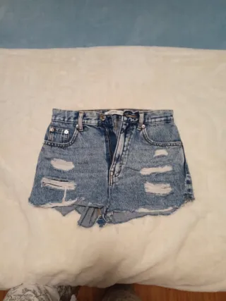 Tus básicos favoritos para el verano! Vendo pack de dos pantalones cortos vaqueros en talla 36. Sientan de maravilla y son muy resistentes. Short 1 (Claro): Denim lavado claro con rotos frontales y bajo deshilachado. Ideal para un look playero. Short 2 (Medio): Denim azul medio con efecto desgastado y rotos sutiles. Muy combinable con cualquier camiseta. Talla: 36 (S). En perfecto estado.