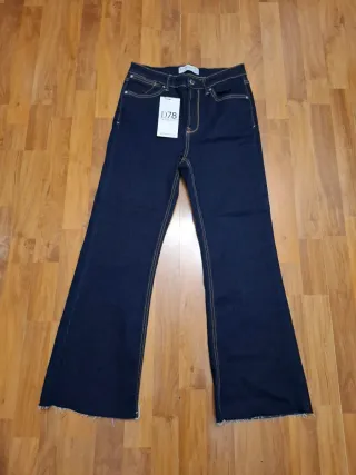 Pantalón vaquero de Stradivarius con un corte acampanado. Nuevo con etiqueta - Diseño de tiro alto. - Bajo deshilachado. - Costuras en contraste.