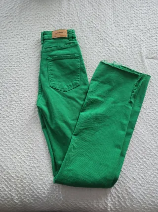 Pantalones vaqueros de Stradivarius en un llamativo color verde. Tienen un corte moderno y son perfectos para añadir un toque de color a tu armario. - Cintura alta. - Bajo deshilachado. - Bolsillos delanteros y traseros.
