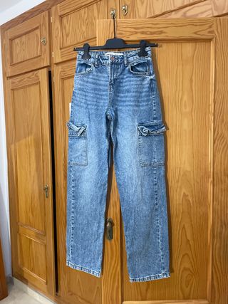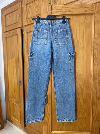 Pantalón vaquero estilo cargo de la marca Bershka. Presenta un diseño moderno y funcional. - Bolsillos cargo en los laterales. - Corte recto. - Lavado desgastado.