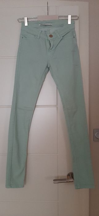 Pantalones pitillo para mujer, en color verde. Son de un tejido suave y ligero, ideales para la primavera. - Corte pitillo. - Cierre con cremallera y botón. - Bolsillos delanteros.
