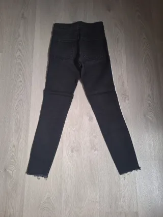 Pantalón vaquero de corte ajustado para mujer ( Super high eaist). Muy bueno, como nuevo, poco uso. - Color negro con efecto desgastado. - Tiro alto. - Cierre con cremallera y botón. - Bolsillos delanteros y traseros.
