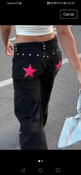 Pantalón vaquero negro con detalles de tachas plateadas y aplicaciones de estrellas fucsia en los bolsillos traseros. - Diseño con tachas. - Estrellas fucsia en bolsillos traseros.