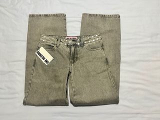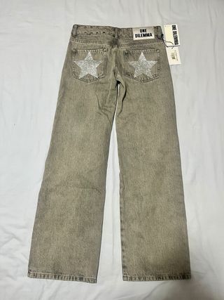 Pantalón vaquero de la marca ONE DILEMMA con un diseño único. - Detalle de estrellas brillantes en los bolsillos traseros. - Cintura con tachuelas decorativas. - Corte ancho en las perneras. GREY JEANS SHINY STAR. Talla 30 Sin estrenar. Regalo de reyes de talla incorrecta