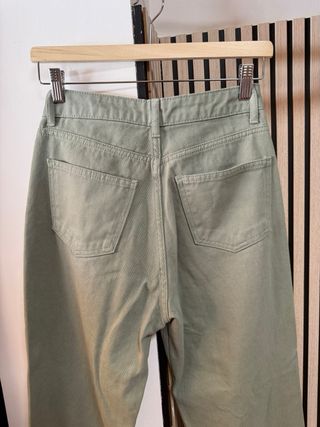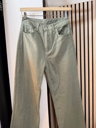Pantalón vaquero de corte recto en color verde oliva. Usado un par de veces. - Cintura alta. - Bolsillos delanteros y traseros. - Bajo deshilachado.