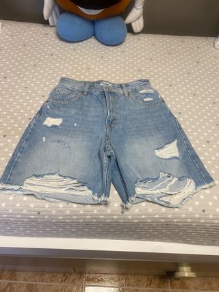 Short vaquero, muy chulo, nuevo con etiqueta. Es de color azul desgastado, con flecos deshilachados en el bajo. Tiene lycra y se ajusta al cuerpo, sienta muy bien. - Diseño casual, juvenil y desenfadado. - Corte de tiro alto. - Tejido denim. - Ideal no sólo para verano, el resto del año con medias también queda genial. - Talla S (36/38)