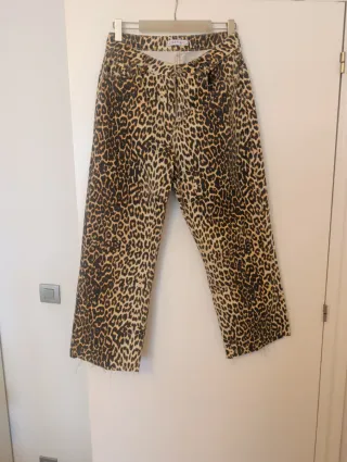 Pantalón vaquero de Pull&Bear con un llamativo estampado de leopardo. Talla 40 - Corte recto. - Bajo deshilachado. - Cierre de cremallera y botón.