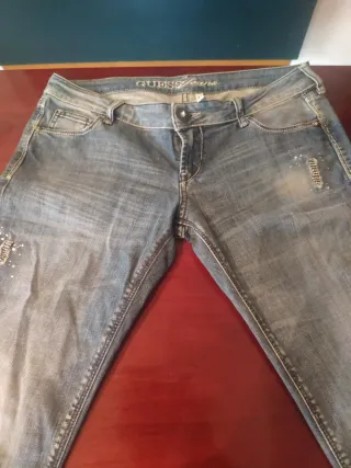 Pantalones vaqueros de la marca Guess en color azul. Tienen un diseño moderno y detalles que los hacen únicos. - Diseño desgastado. - Adornos brillantes en bolsillos.
