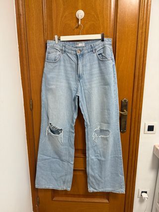 Pantalón vaquero de corte ancho y estilo desgastado. - Tiro alto. - Pierna recta y ancha. - Detalle de rotos en la zona del bolsillo.
