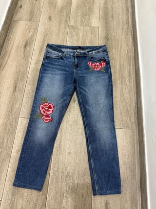 Pantalones vaqueros de corte moderno con un toque distintivo. - Diseño con bordados florales en color rosa. - Lavado vaquero clásico.