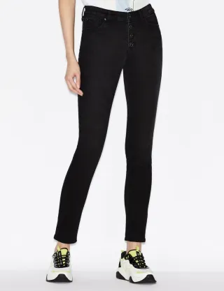 Pantalones vaqueros de corte ajustado A | X Armani Exchange Women's, J27 Super-Skinny Button-Fly Jeans, Black, 27R - Cierre de botones. - Diseño de cinco bolsillos.